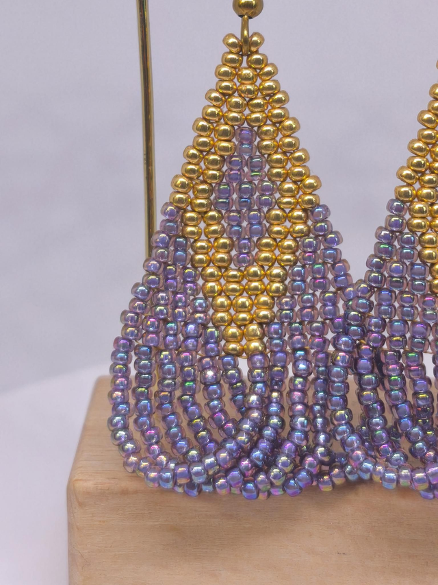 Tissées à la main à partir de perles de rocailles miyuki dorées et violettes aux multiples reflets, ces boucles d'oreilles apporteront une touche colorée et chic à votre style