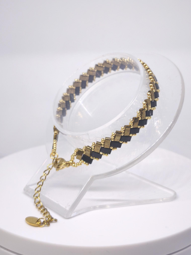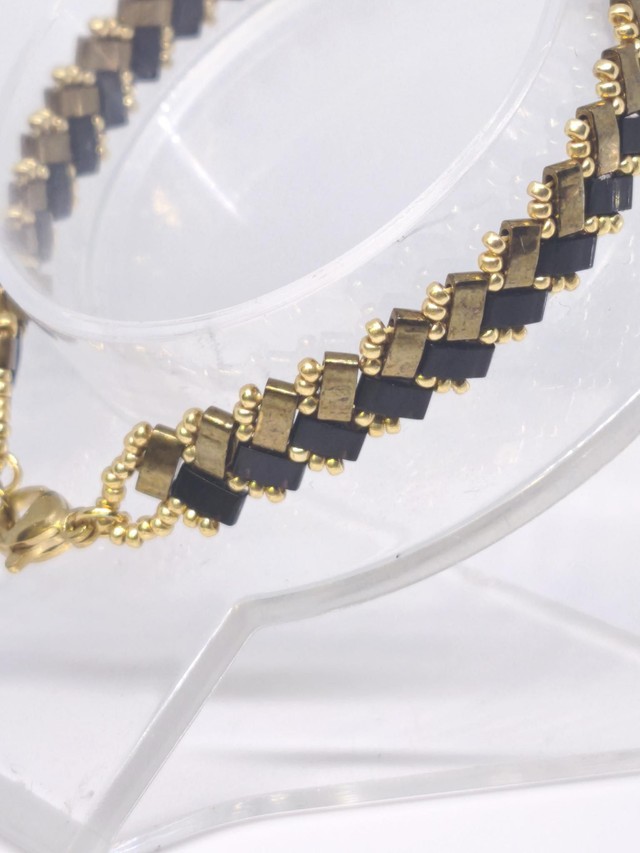 Tissé à la main, perles de rocailles miyuki 15/0 doré durocoat (couleur qui dure dans le temps) et perles half tila miyuki bronze et noir