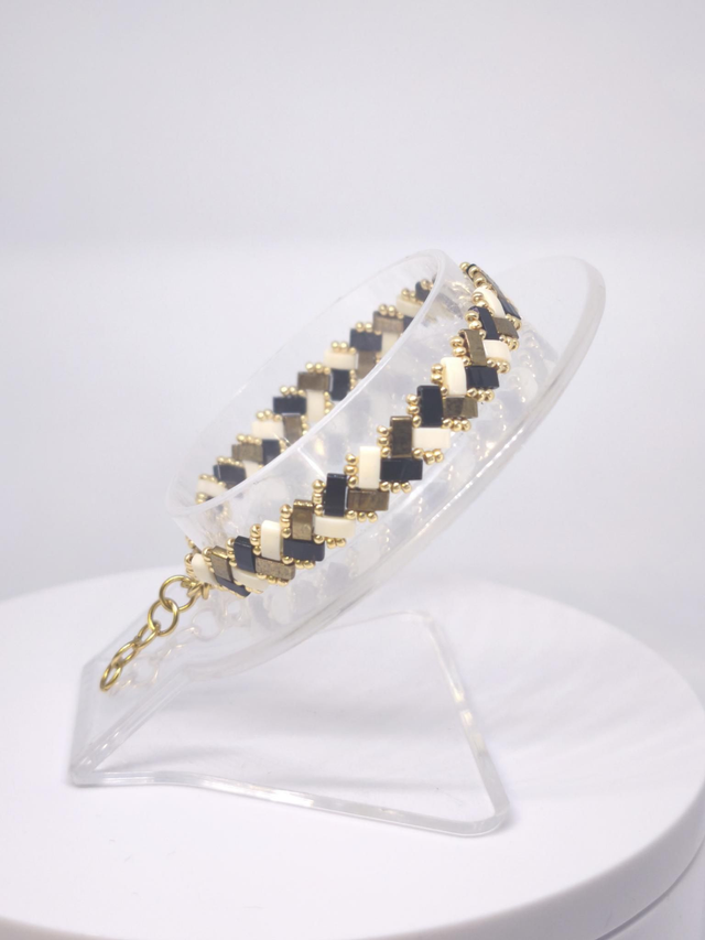 Tissé à la main, perles de rocailles miyuki 15/0 dorées et perles half tila miyuki noires, ivoires et bronze