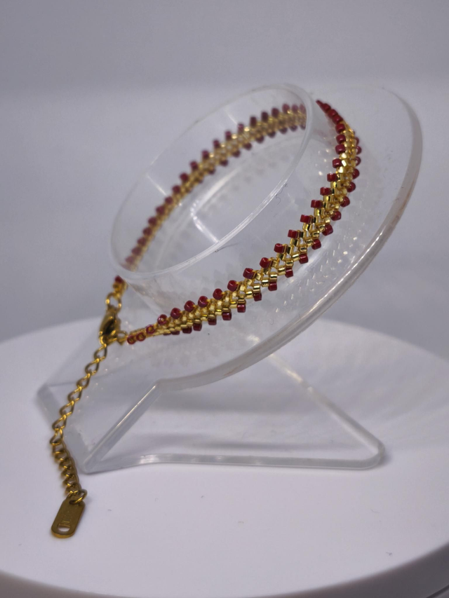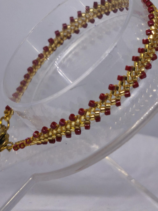 Tissé à la main à partir de perles miyuki delica dorées et cranberry