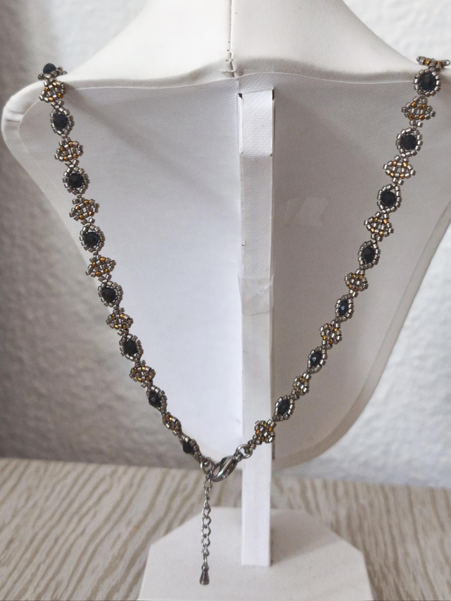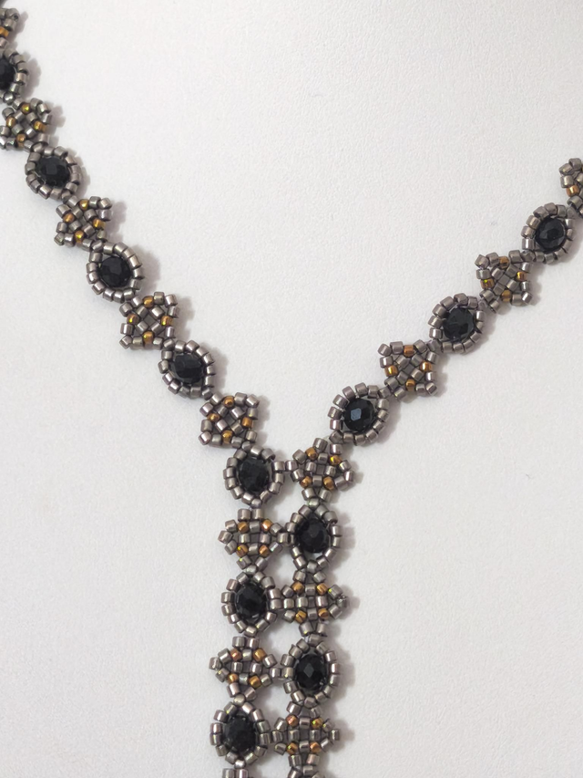 tissé à la main à partir de perles toho noires, grises métallisées et bronzes et de perles de verre a facettes noires 4mm