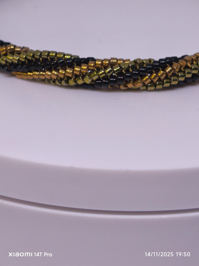 composé de perles miyuki delica noires, bronzes, vertes olive et fil miyuki qui donne une certaine souplesse à ce joli bangle.
