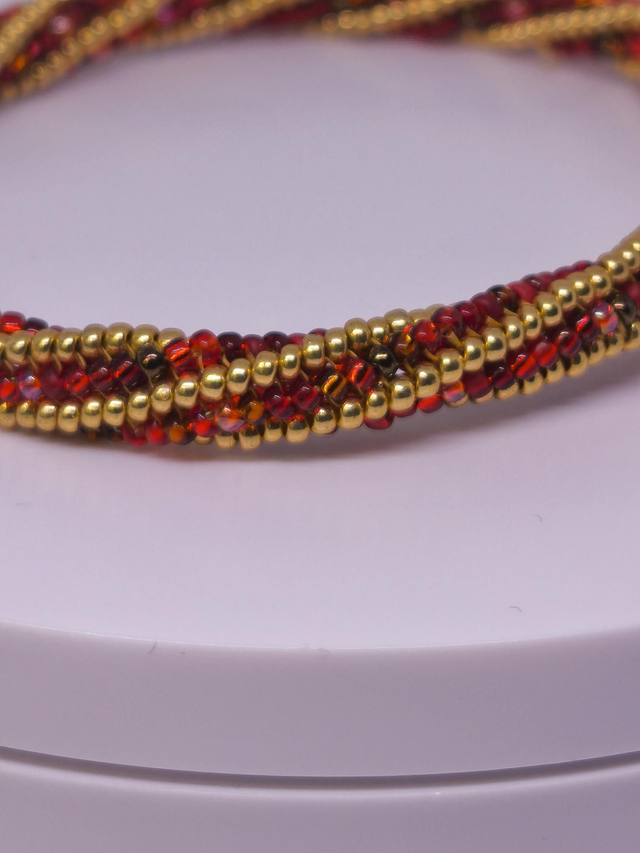 composé de perles de rocailles miyuki dorées , mélange de rouge (magma) et fil miyuki qui donne une certaine souplesse à ce joli bangle.