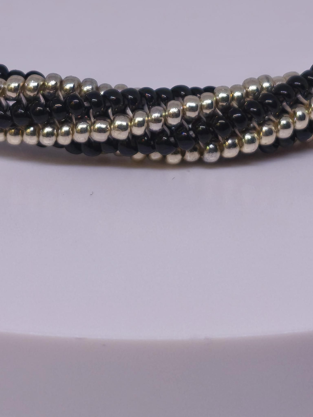 composé de perles de rocailles miyuki argentées et noires et fil miyuki qui donne une certaine souplesse à ce joli bangle.