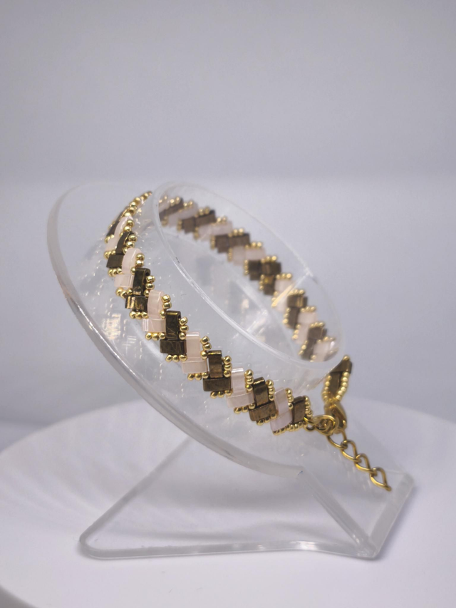 Tissé à la main, perles de rocailles miyuki 15/0 doré durocoat (couleur qui dure dans le temps) et perles half tila miyuki bronze et rose pale