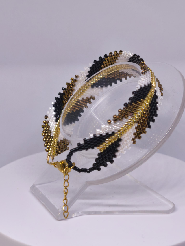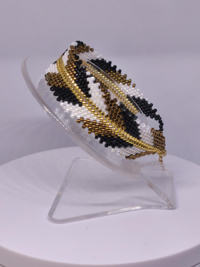 Bracelet tissé à partir de perles miyuki delica noires, blanches, bronzes et dorées.