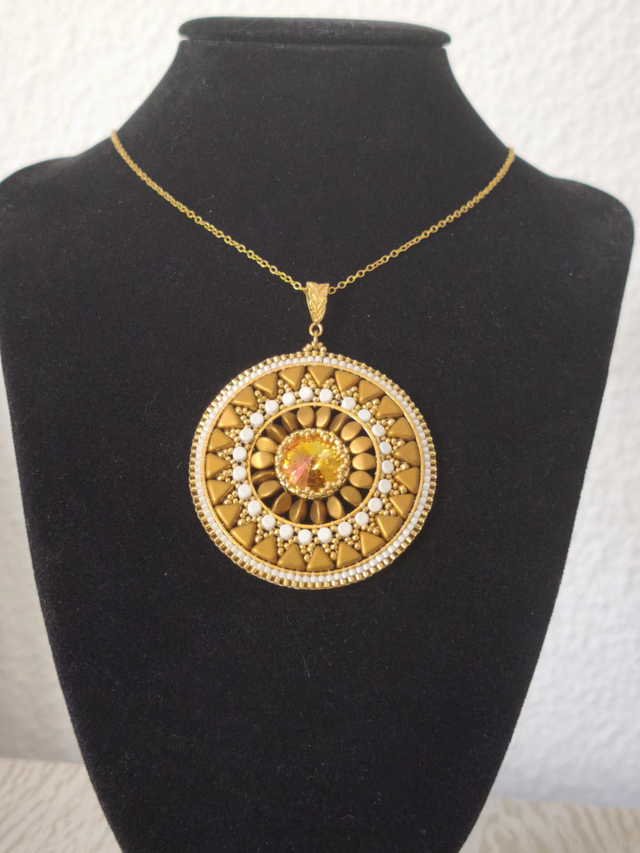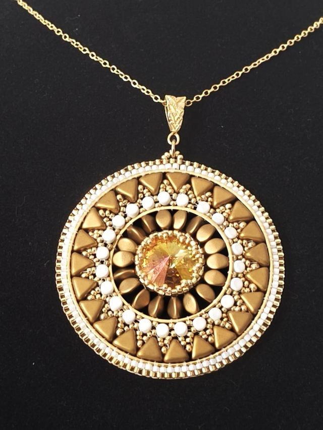 Son pendentif circulaire, inspiré des mandalas solaires, associe délicatement perles dorées, perles ivoire et un cristal central aux reflets dorés-orangés. Chaque élément est minutieusement assemblé pour créer une pièce lumineuse, unique et harmonieuse.