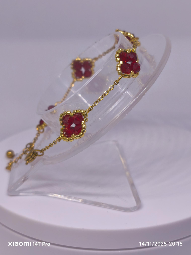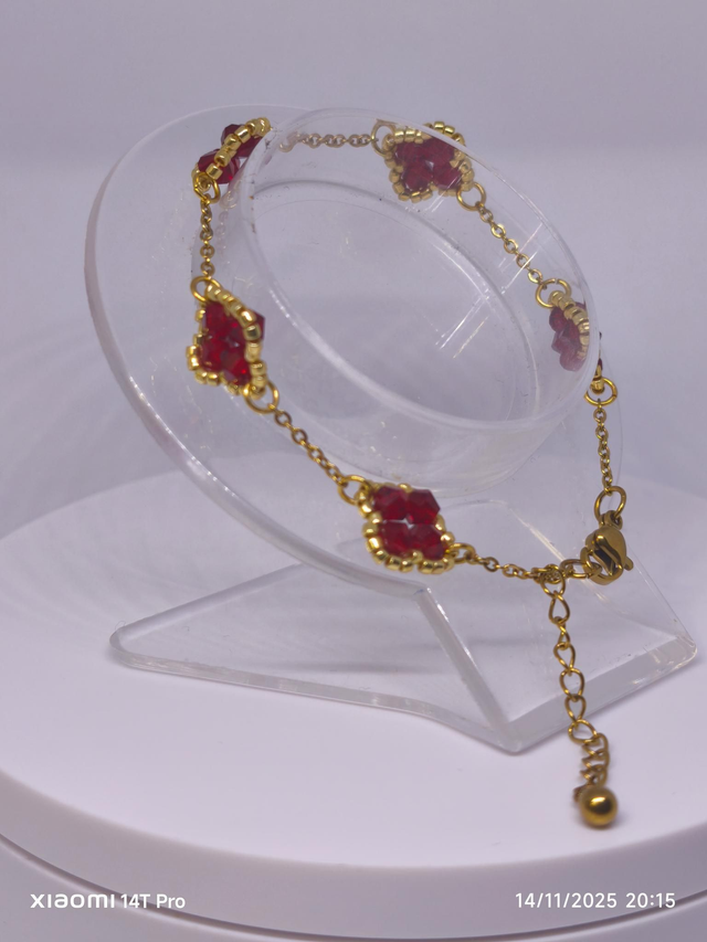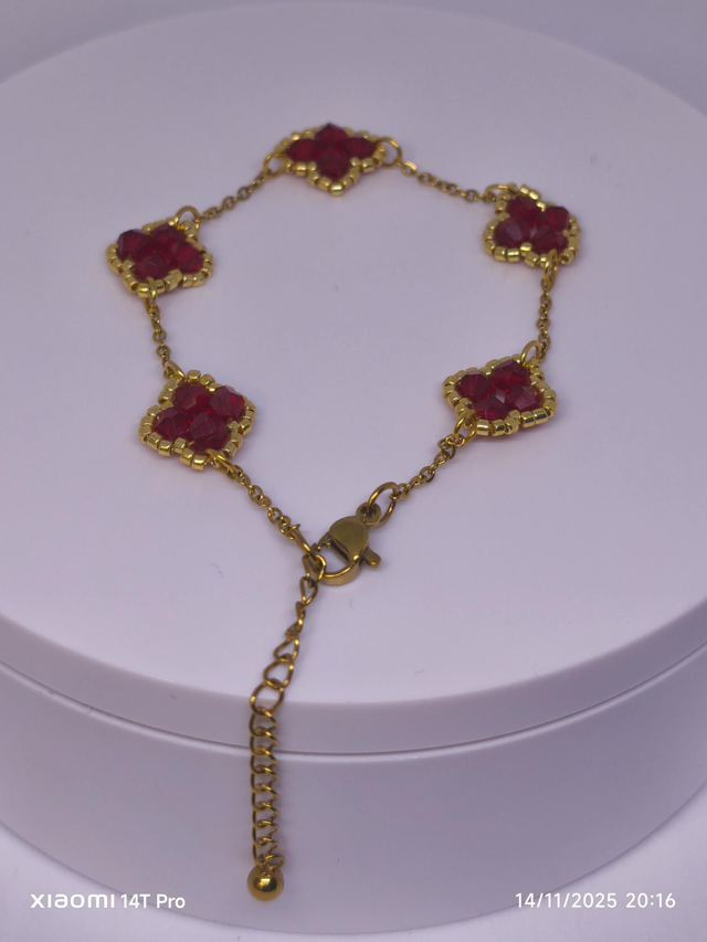 Bracelet fin tissé à la main avec perles Miyuki dorées et perles de verre rouge. Chaîne et fermoir en acier inoxydable.